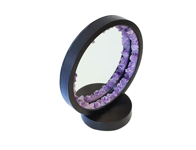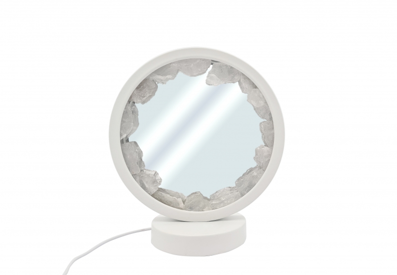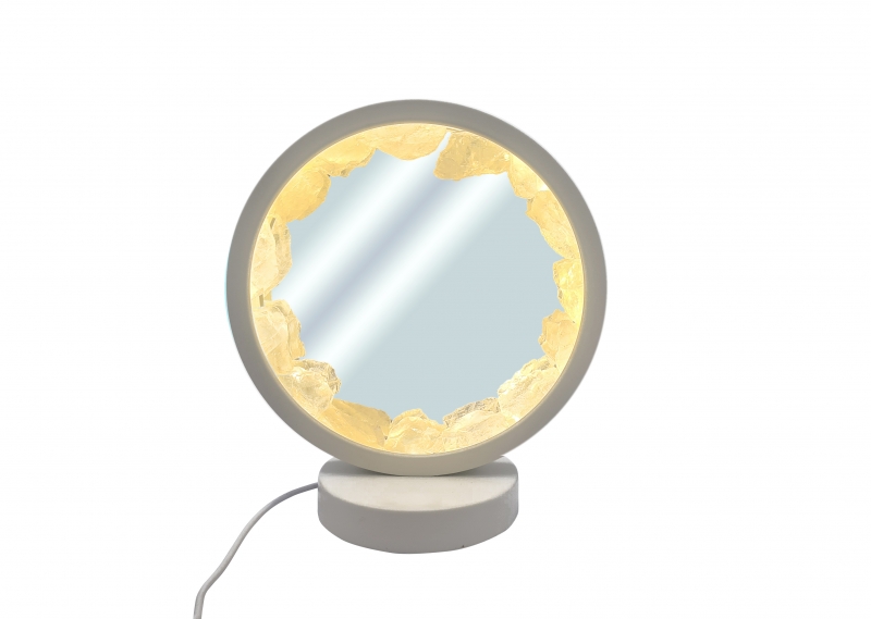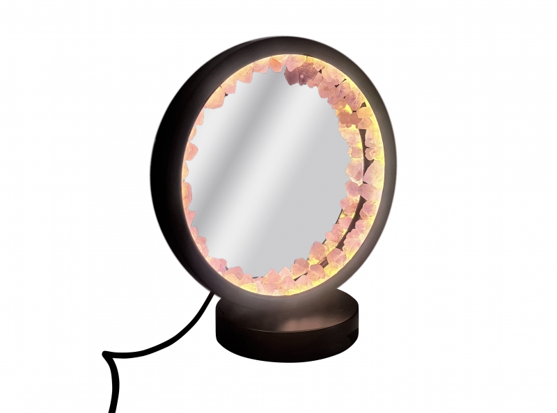 Elegantna okrogla svetilka velikosti 21 × 17 cm. S kristali ametista ali kamene strele in sijočim ozadjem ogledala ustvari čarobno igro svetlobe in senc. Led svetloba ustvarja prijetno vzdušje – popolno za večerne sprostitev ali meditacijo. Na izbiro: