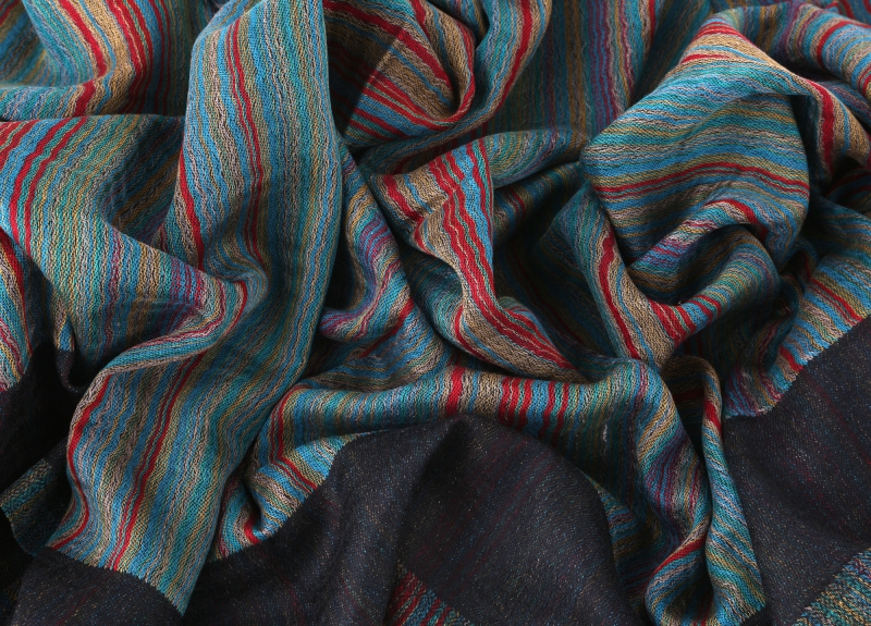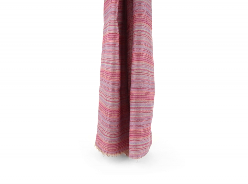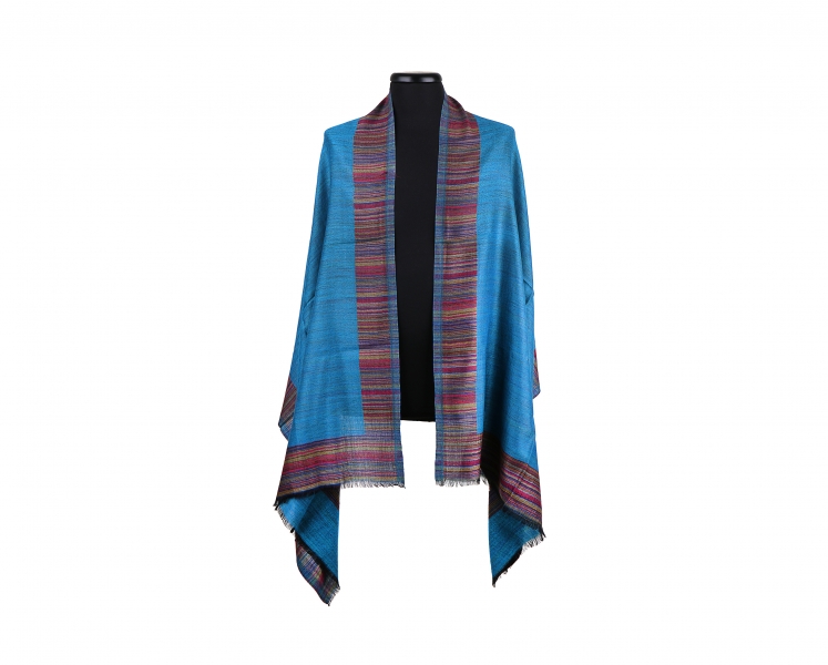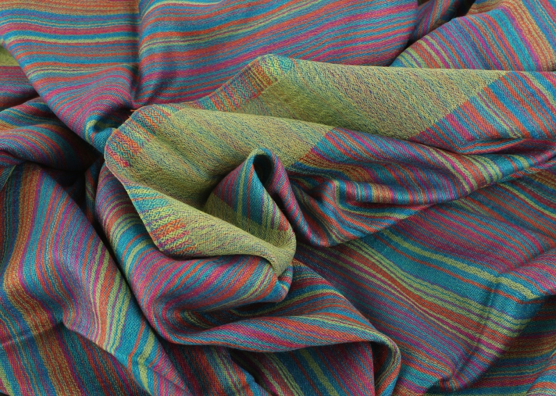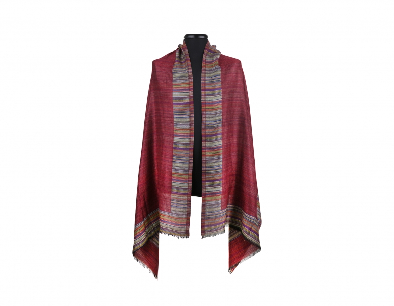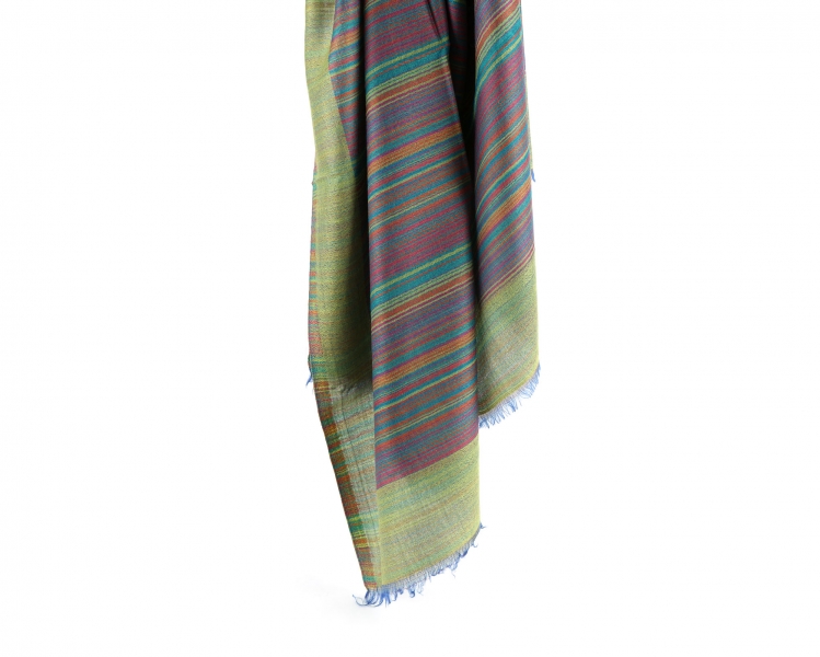 Svilen šal z borduro in barvnim prelivanjem. Sestava: 80 % svila, 20 % volna. Velikost 80 x 200 cm. Na izbiro variacije osnovne barve: 1) Rdeča; 2) Zelena - svetla ; 3) Vijolična (slika simbolična); 4) Roza rdeča; 5) Temno Zelena - temna. Izdelano v Kašmirju (Indija). Oglejte si 10 načinov kako nositi šal