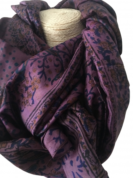 Lahkoten svilen šal z barvnim potiskom VODNE LILIJE in cvetličnim vzorcem. Velikost 50 x170 cm, 100 % svila. Barva: vijolična, modra, oranžna