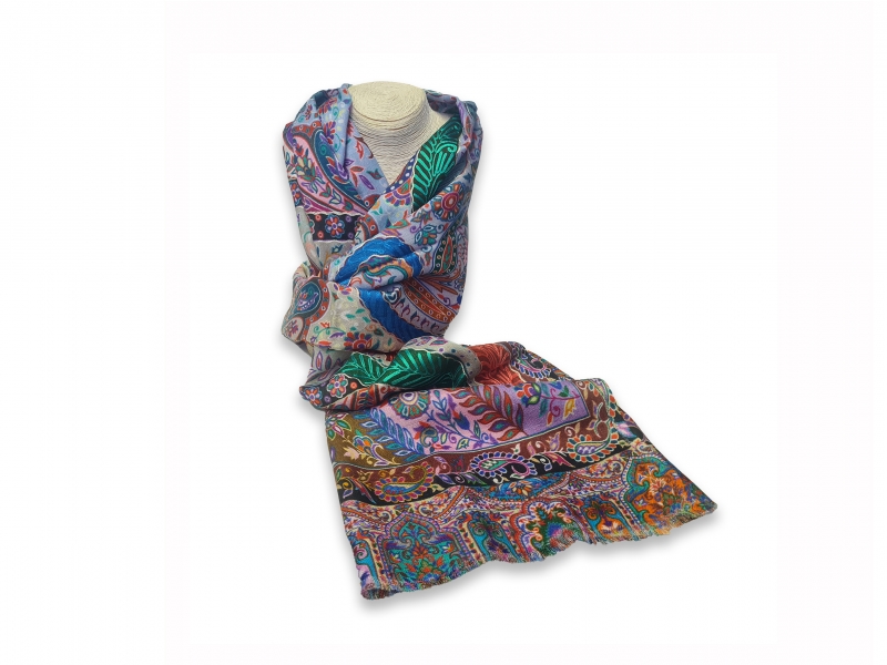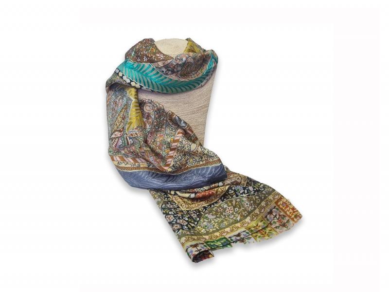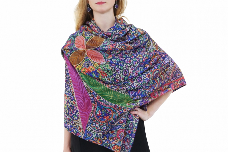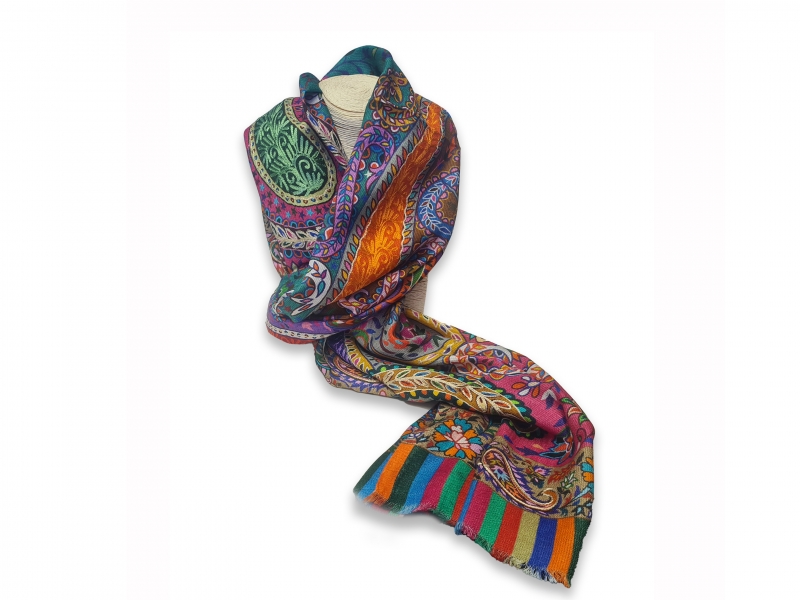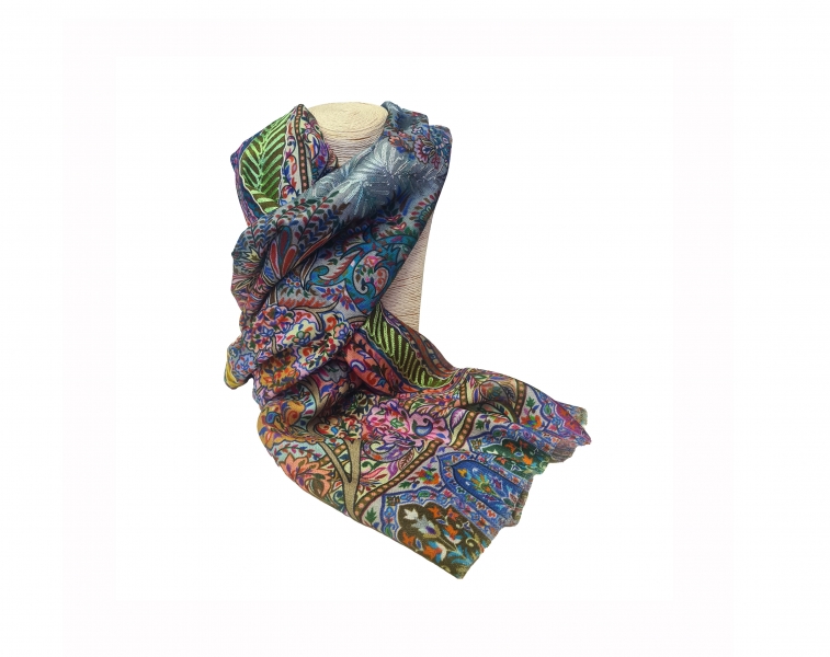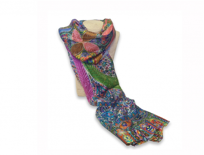 Modni svilen šal z živahnimi barvami z vezenimi vzorci Jamawar - pridih Orienta. Velikost je 70 x 200 cm; Material: 90 % svila, 10% modal. Vsak šal je unikatna kombinacija vzorcev in barv. Barve: zelena, roza, vijolična, oranžna, rumena, modra, rdeča. Izdelano v Kašmirju (Indija).