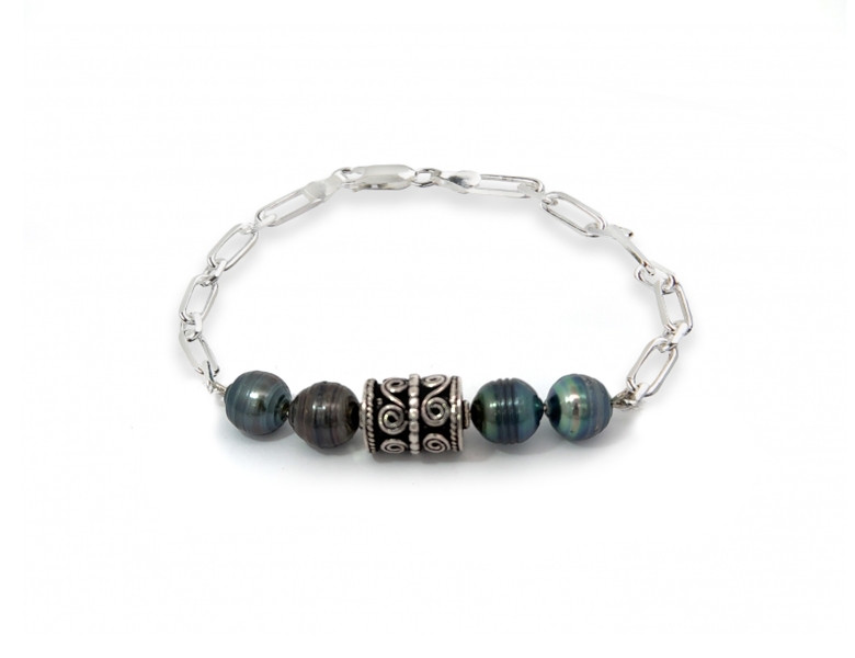 Naravni Tahiti biseri 9–10 mm z globokim, večbarvnim leskom pritegnejo pogled in ustvarijo luksuzni vtis. V središču jih dopolnjuje srebrni ornament s spiralnim motivom, ki doda strukturo in karakter. Kombinacija z verižico (pletenje Anker) daje zapestnici močan in brezčasen videz. Prilagodljiva dolžina 17–22 cm, teža 14,8 g.