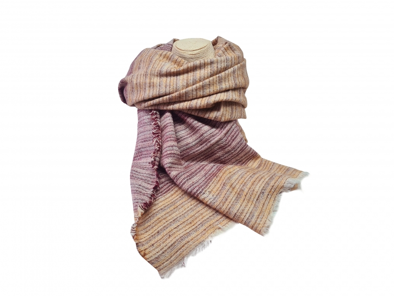 Volneni šal iz kuhane kašmirske volne je mehak, zračen in prijetno topel, velikost 90 × 180 cm (100 % volna). Barvno bogata tkanina združuje prelive roza, bež, ciklamnih in rumenih tonov, ki ustvarijo modno živahen in ženstven videz. Izdelan v Kašmirju.