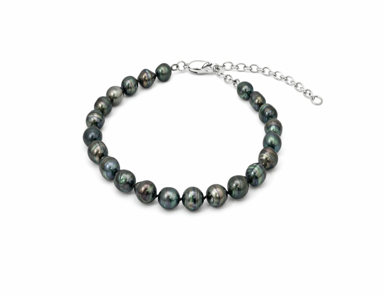 Zapestnica s Tahiti biseri 8 – 10 mm v nežnih baročnih oblikah. Njihov rahlo mavričen lesk in vidne površinske nepravilnosti ustvarijo prefinjen in izrazit značaj. Vozlani biseri zagotavljajo eleganten padec in udobje, srebrna zaponka s podaljškom nudi varno in diskretno zapiranje. Dolžina od 17 + 4 cm podaljška.