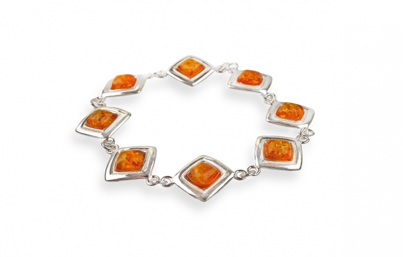 Jantar srebrna zapestnica s prvovrstnim baltskim jantarjem oblikovanim v karo člene s srebrno obrobo. Jantar velikosti 7 x 7 mm, teža zapestnice 12,3 g. Dolžina 19- 21 cm.