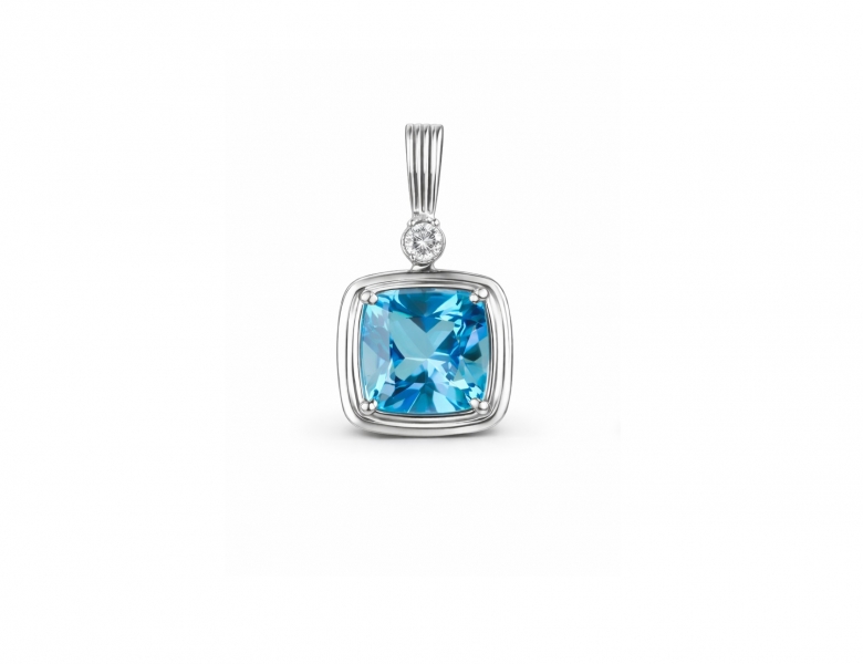 Zlat obesek modri topaz in diamanti - minimalističen dizajn. Modri Topaz: oblika blazinice (Couchion cut) 9 x 9 mm, barva Swiss Blue, 3,85 Ct. Diamanti: teža 0,03 Ct, premer 2 mm, barva H, čistina S1. Belo zlato 18 K; 2,53 g. Na voljo tudi kot komplet z uhani NEA.